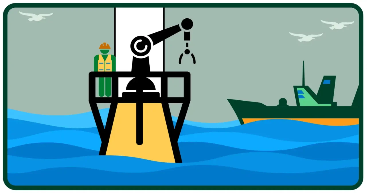 The adjacent illustration depicts loading wind turbine blades onto a transport ship from an onshore staging site.