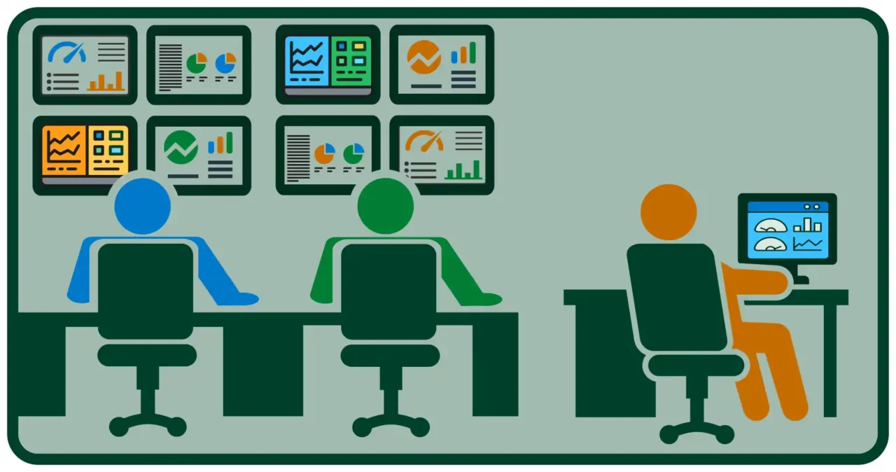 Graphics representing an operations control center, transmission interconnection on Cape Cod, community microgrid development, and urban wind turbines.